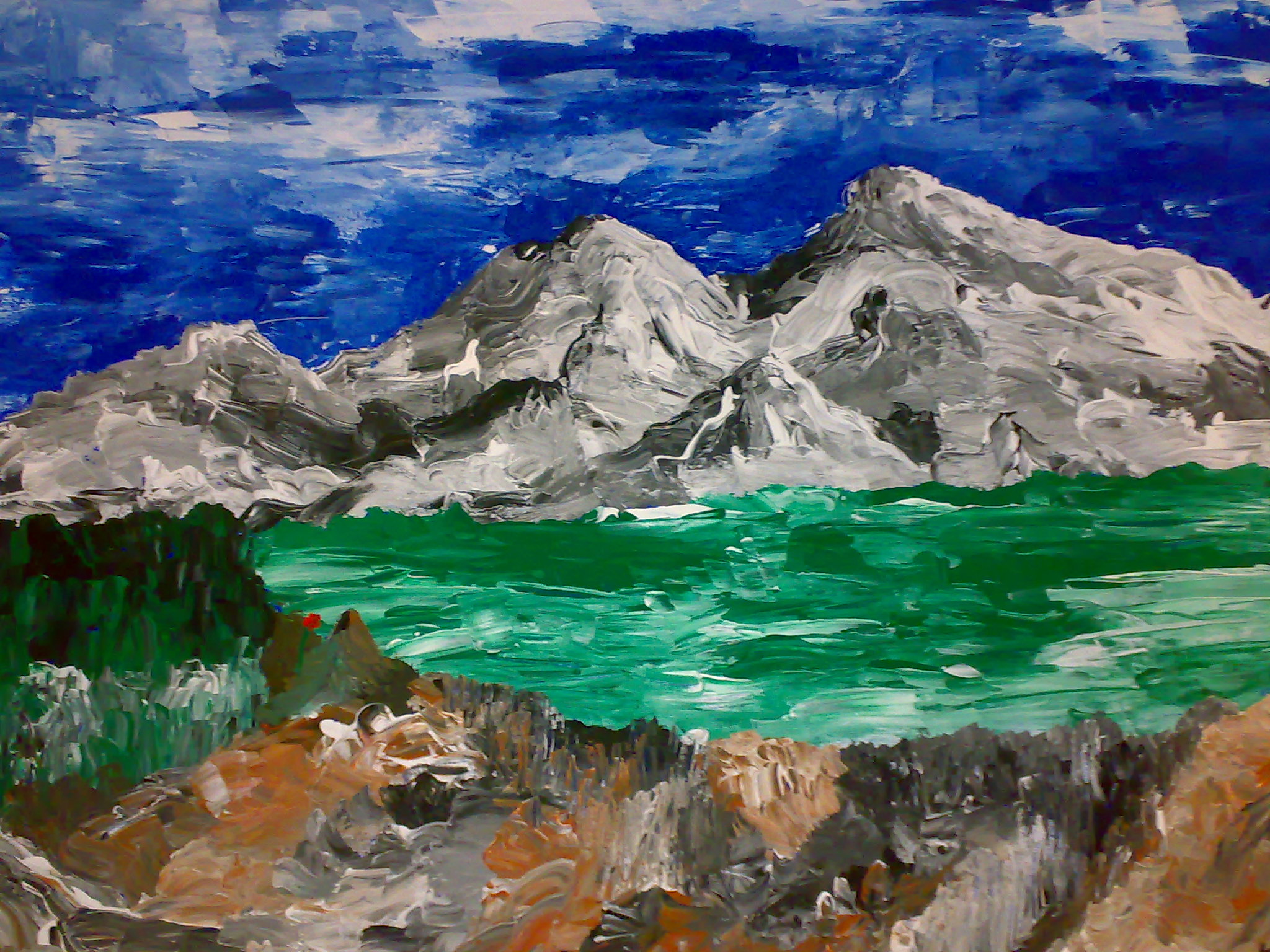 Bergsee mit Rose. Acryl. Klaus Völker, 2009 Tauchen Sie ein in eine zerklüftete, bewegte Landschaft. Es ist sehr stürmisch, aber eine kleine rote Rose hält dem Wind Stand... |